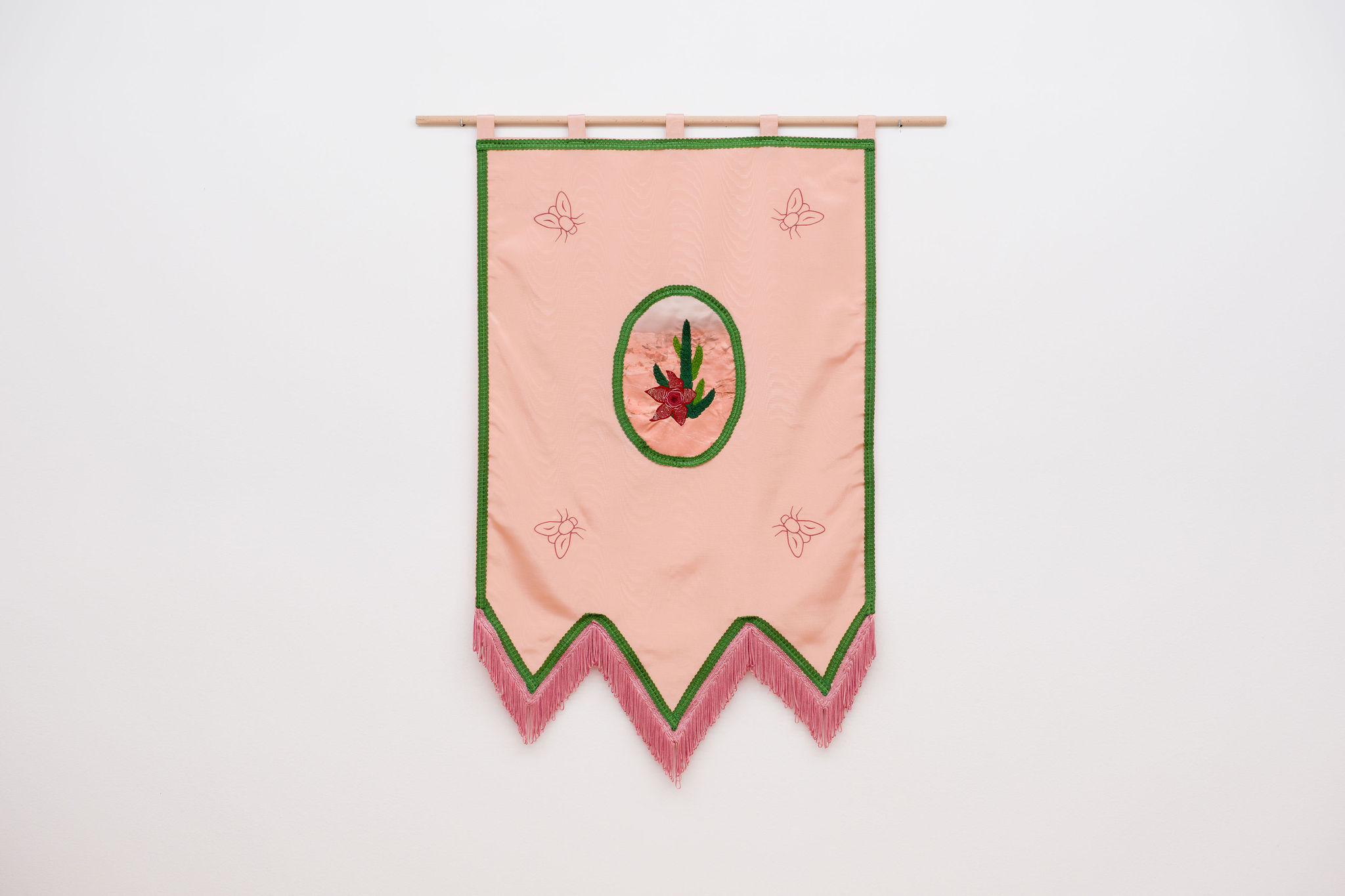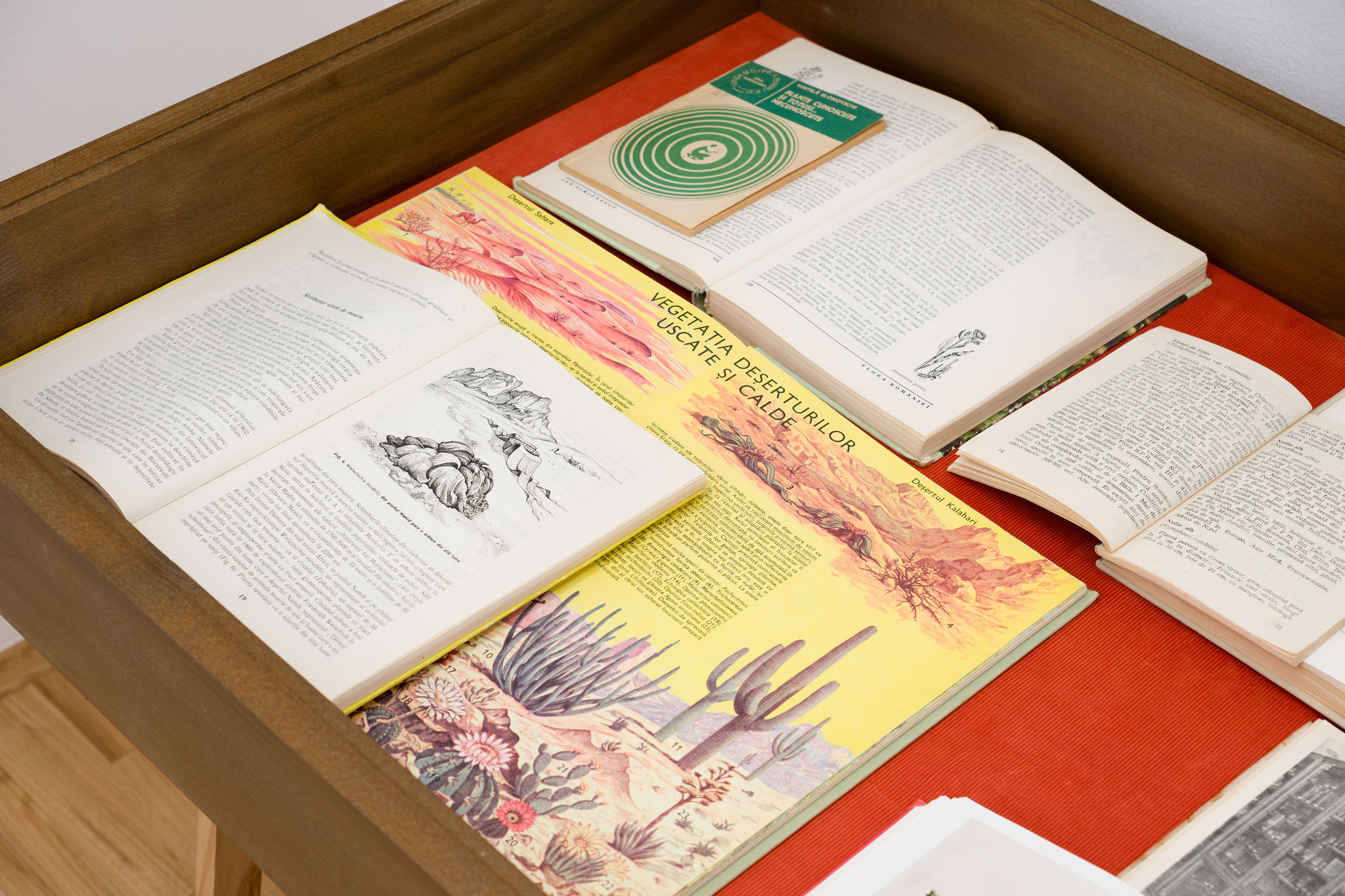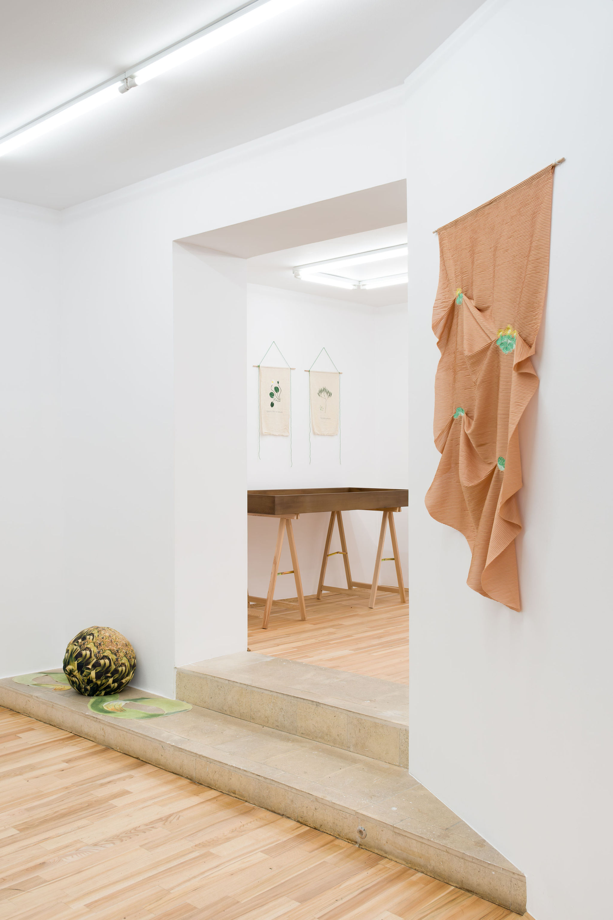 In her first solo show with Zina Gallery, Thea Lazăr recreates an aesthetic of encyclopaedic plant collections, drawing much of the exhibition’s thematic language from Joseph Arnold’s work The Kunstkammer of the Dimpfels, a Family of Ironmongers and Traders from Regensburg (1668), which portrays a cabinet of curiosities— the early ancestor of the modern museum, a space with preserved specimens, automata and remarcabilia, presented by collectors as a microcosm of the world. The video-work A Dying Leaf Should Be Able to Carry the Weight of the World (2023) serves as a discrete guide through the Botanical Garden and Botanical Museum in Cluj-Napoca, becoming the foundation for Thea’s exhibition. She creates her own cabinet of curiosities, a space suspended into an introspective territory, where fossils, textiles, and botanical specimens are subjectively indexed and preserved.