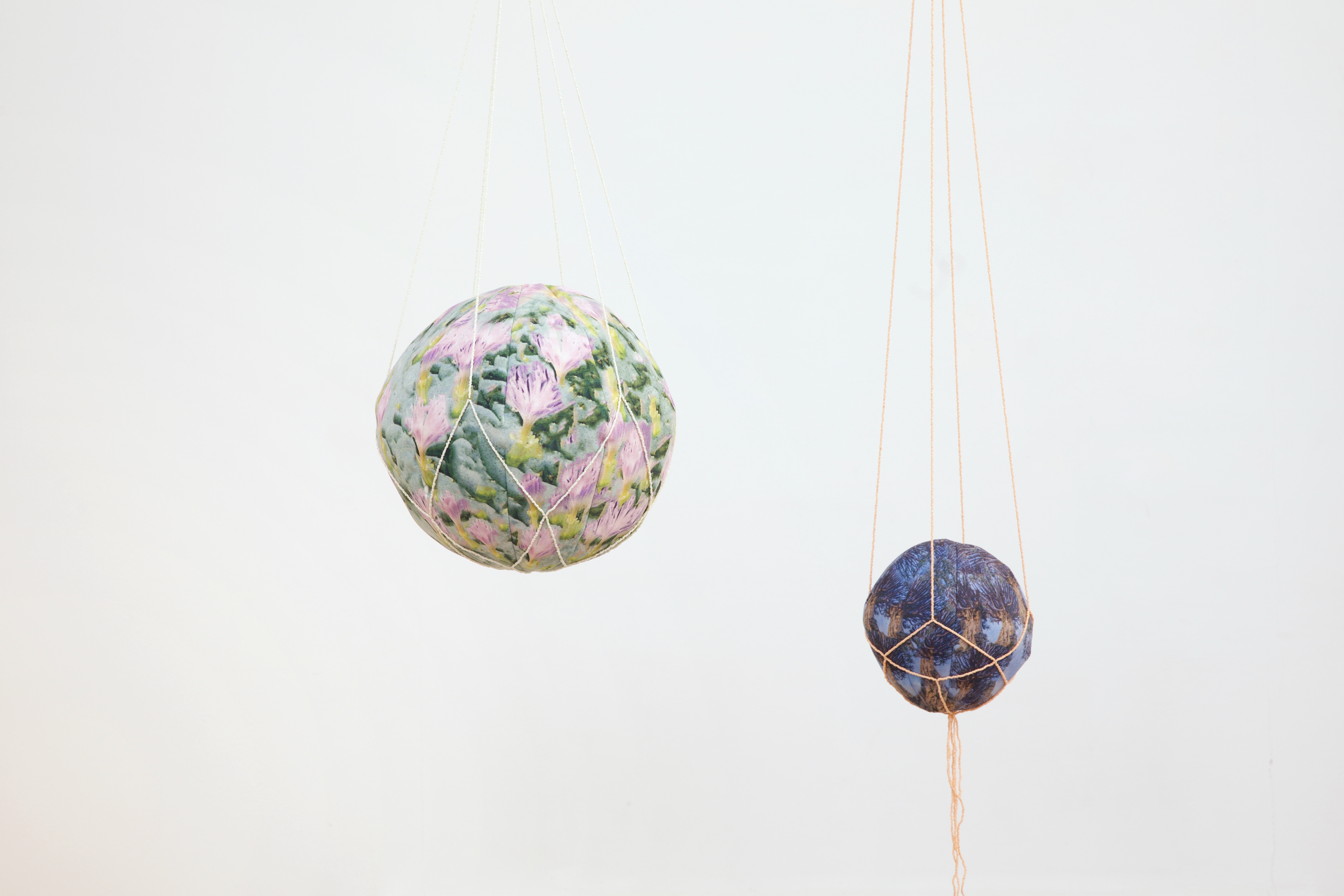 “Thea Lazăr’s installation work departs from her long-term observation and research on several endemic plants that survive the dry and harsh condition of the Namib and Chihuahuan deserts. Consisting of five spheres and a new video work, the installation draws a speculative connection between the draughts caused by climate change and a fictitious global scenario of desert-plants monocultures surviving in the absence of water or rain. The artist offers different visual alternatives in the form of soft planets to form a constellation of potential resilient “Worlds” sustained by the plants’ potency for adaptability and survival. The video work Lost Landscapes of a Desert Age leads the viewer into a magnified experience of these desertified landscapes, set along a narrative questioning scarcity, endurance and the passing of time.”